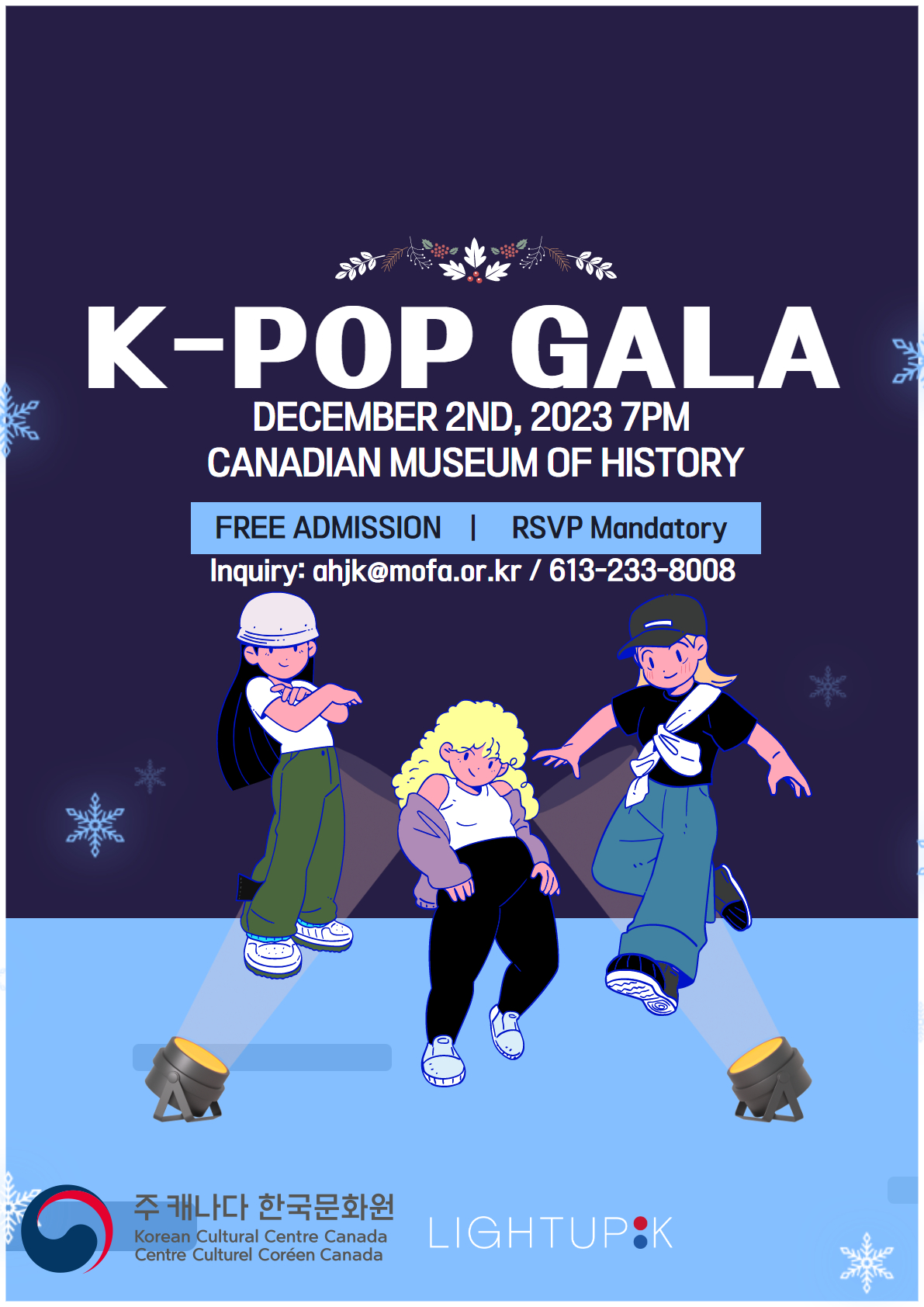 The Korean Cultural Center Canada and Lightup K are happy to host this year's 2023 K-POP GALA! Come out and celebrate K-Pop with amazing teams as well as cheer for your friends and family!
