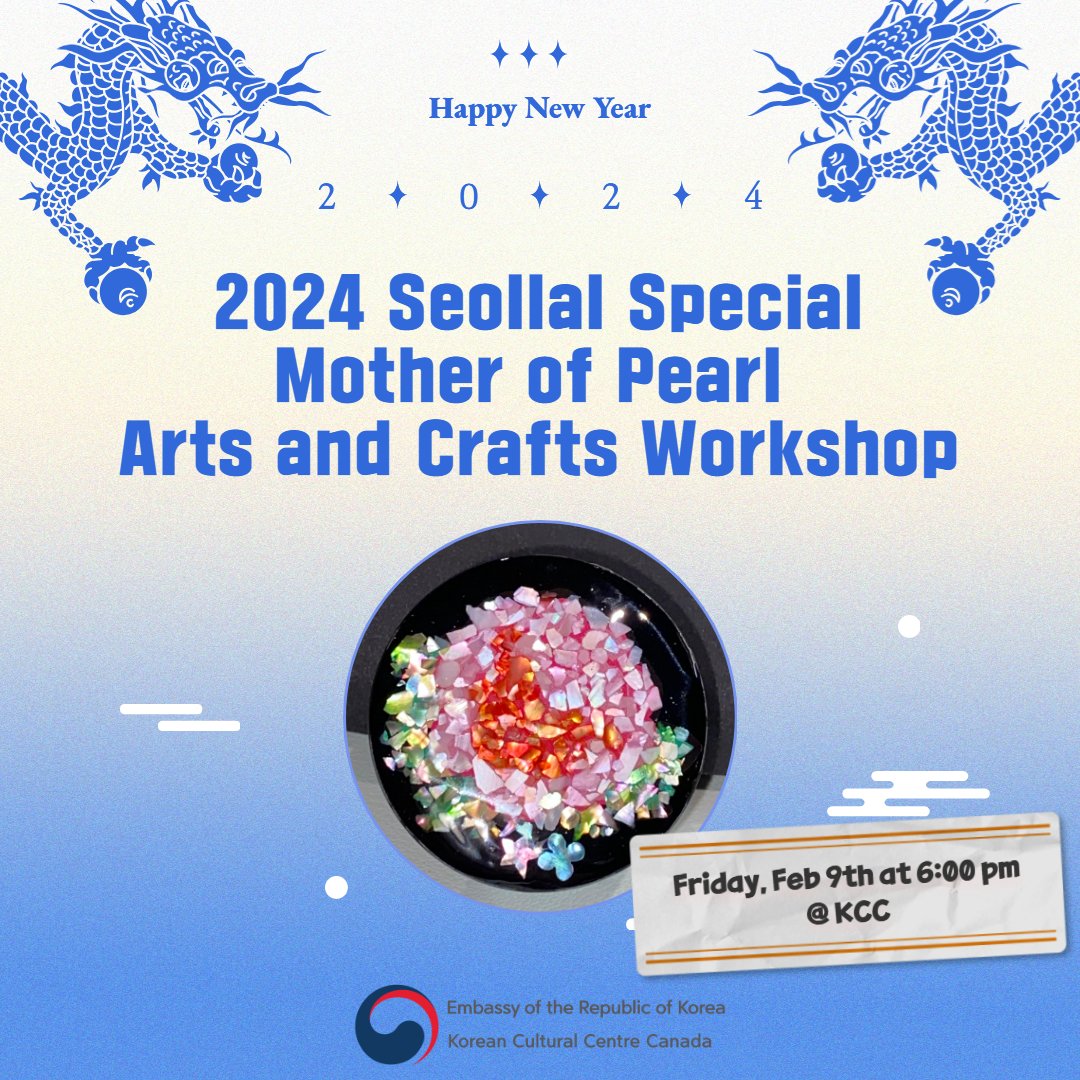 In celebration of Seollal, the Korean Lunar New Year, the Korean Cultural Centre is pleased to host the "2024 Seollal Special: Mother of Pearl Arts and Crafts Workshop" on Friday, February 9th, 2024, at 6 pm (ET). This workshop will introduce Seollal and its tradition and culture, followed by mother of pearl arts and crafts activity.