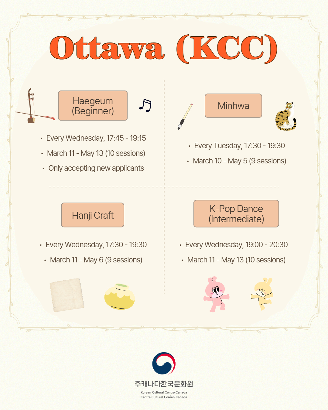 This semester, we are offering Korean music, art, dance, sport classes in Ottawa, Montreal, Toronto, and online.