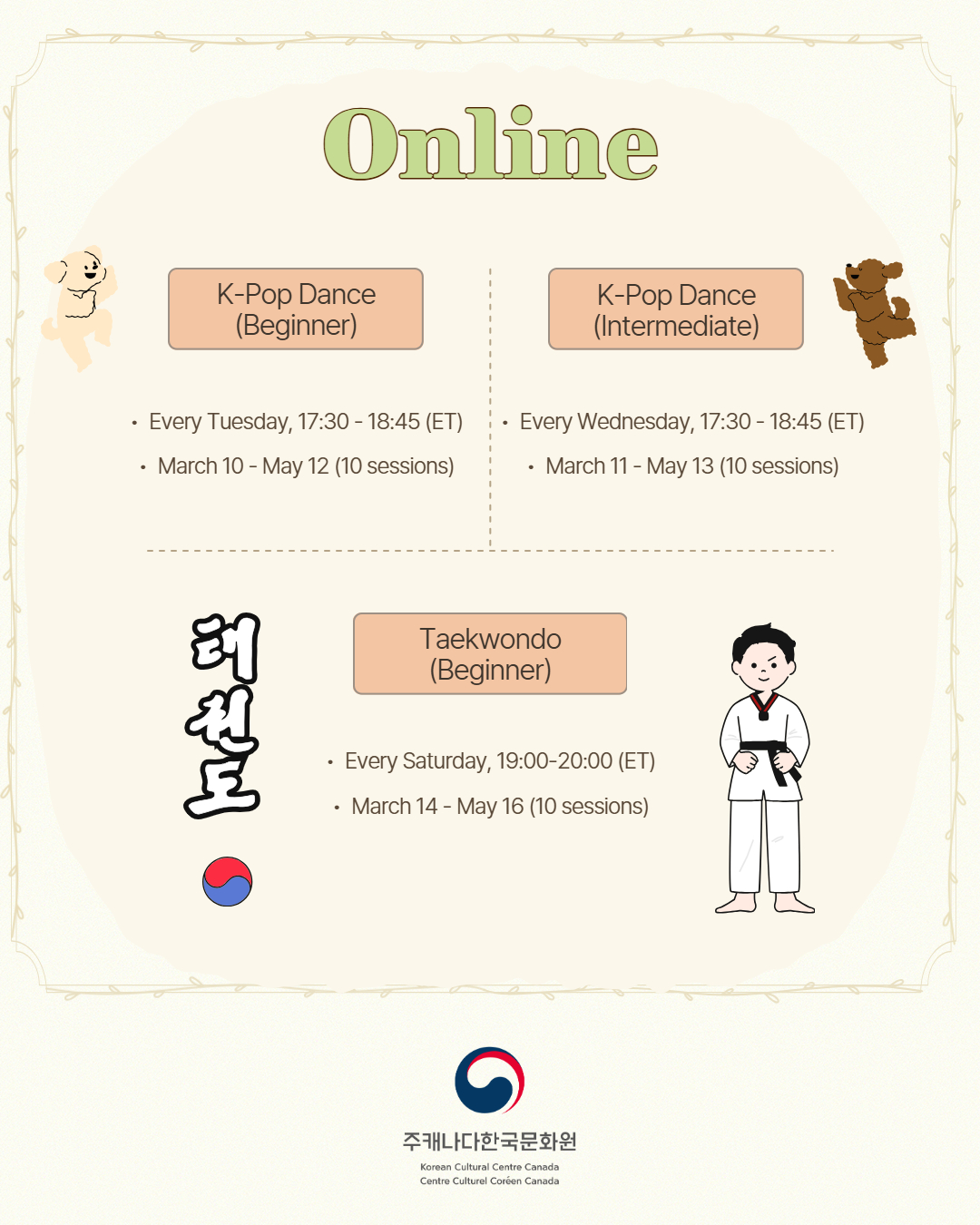 The Korean Cultural Centre Canada is excited to announce the launch of the 2026 Spring K-Culture Courses this March. Classes will run from March to May.