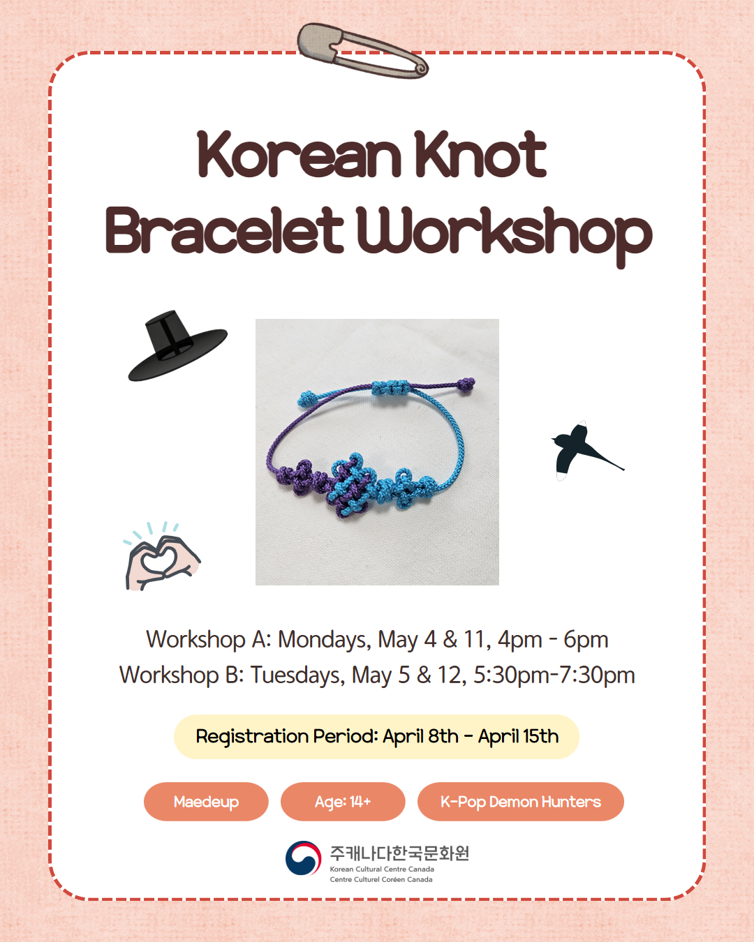 If you have seen ‘K-Pop Demon Hunters’, you may have noticed the bracelet with beautiful knot patterns! Join us for this workshop where you will make your very own Korean Knot Bracelet!