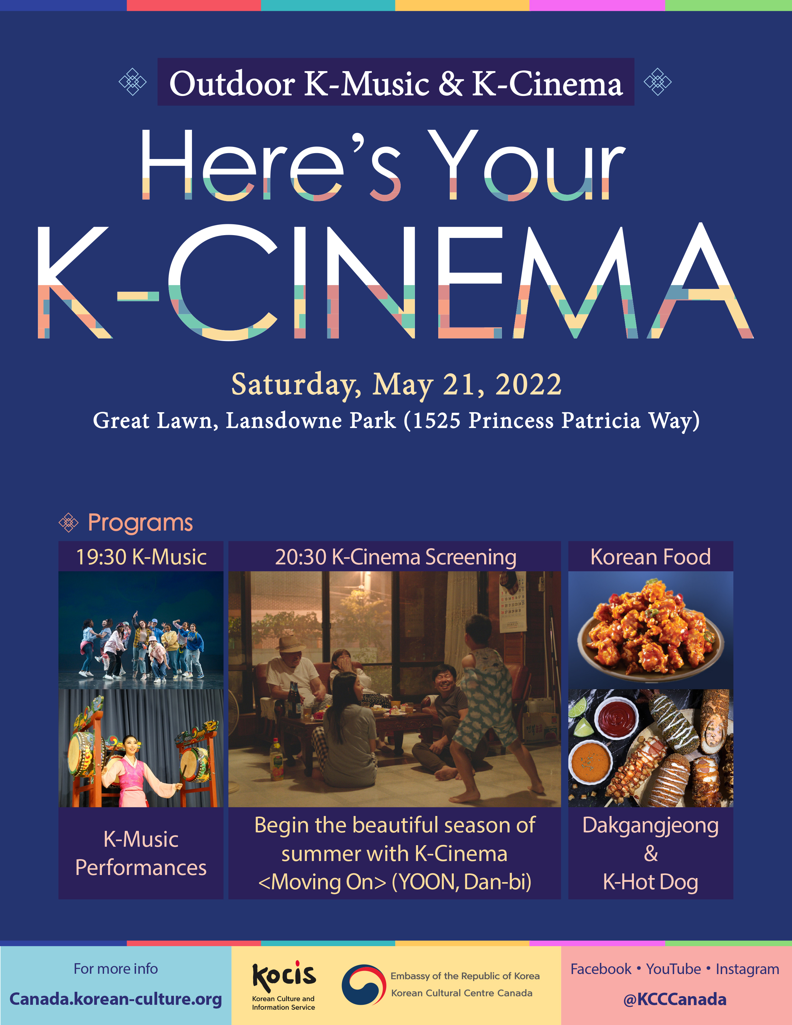 내용: 7시 30분부터 시작되는 행사에서는 삼고무, 난타, 해금, 케이팝 등 한국의 다양한 음악 공연이 진행되며, 같은 장소에서 8시 30분부터 윤단비 감독의 <남매의 여름밤> (2020) 야외 상영한다.