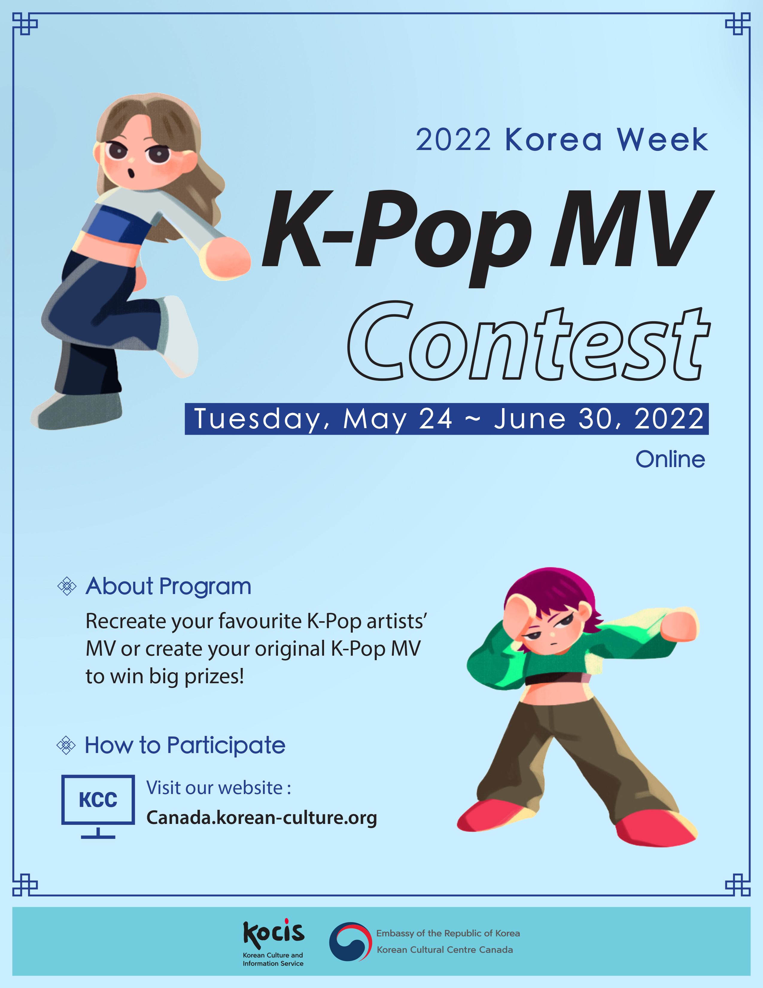 내용: 참가자들이 좋아하는 아티스트의 케이팝 뮤직 비디오를 재현하거나 혹은 자신만의 색과 연출로 새로운 뮤직 비디오를 만들어 제출하면 된다.