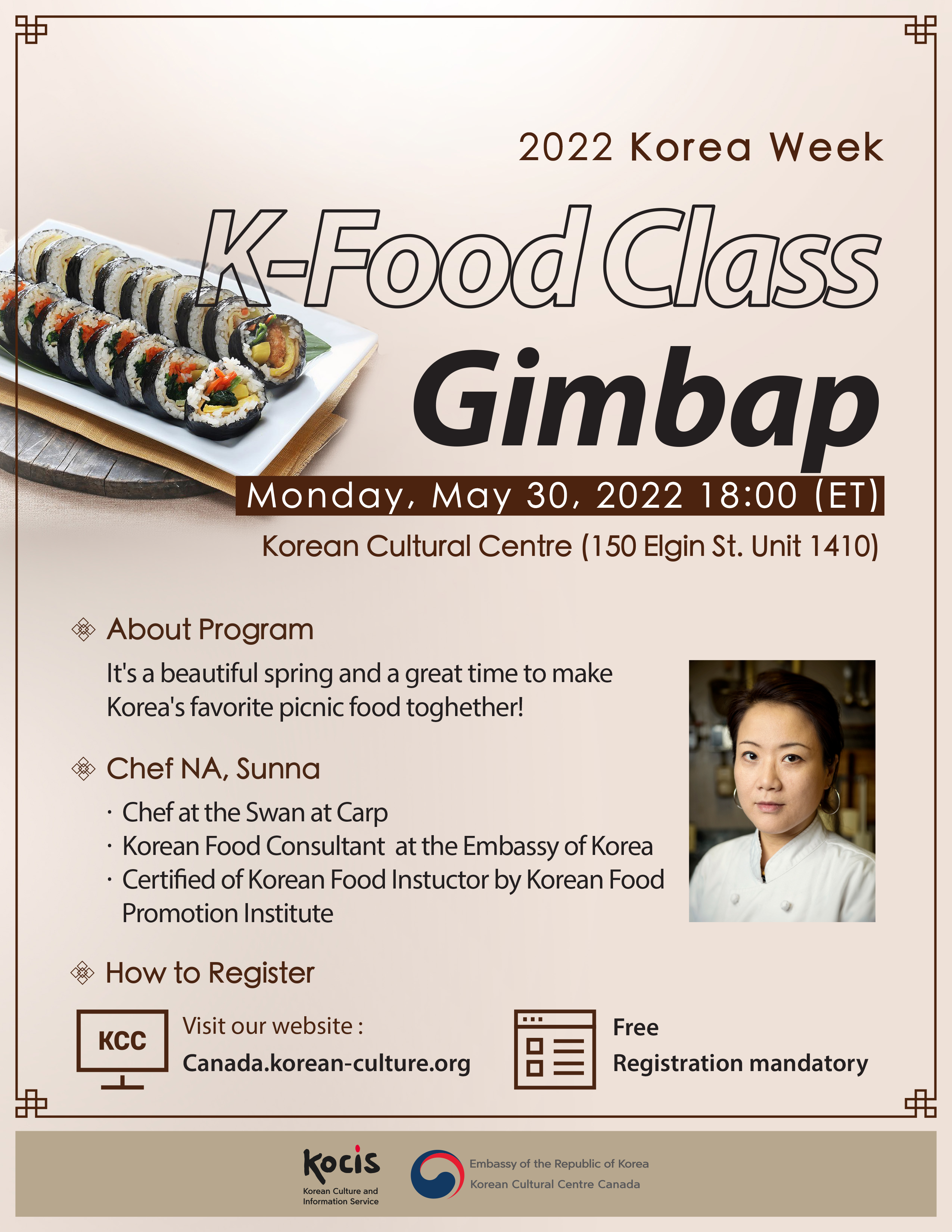 내용: 5월 소풍과 나들이에 빼놓을 수 없는 한국의 음식인 김밥. 봅맞이와 함께 문화원은 문화원 한식강좌 선생님인 나선나 셰프와 함께 캐나다인들이 직접 김밥을 만들어볼 수 있는 체험현장을 마련한다.