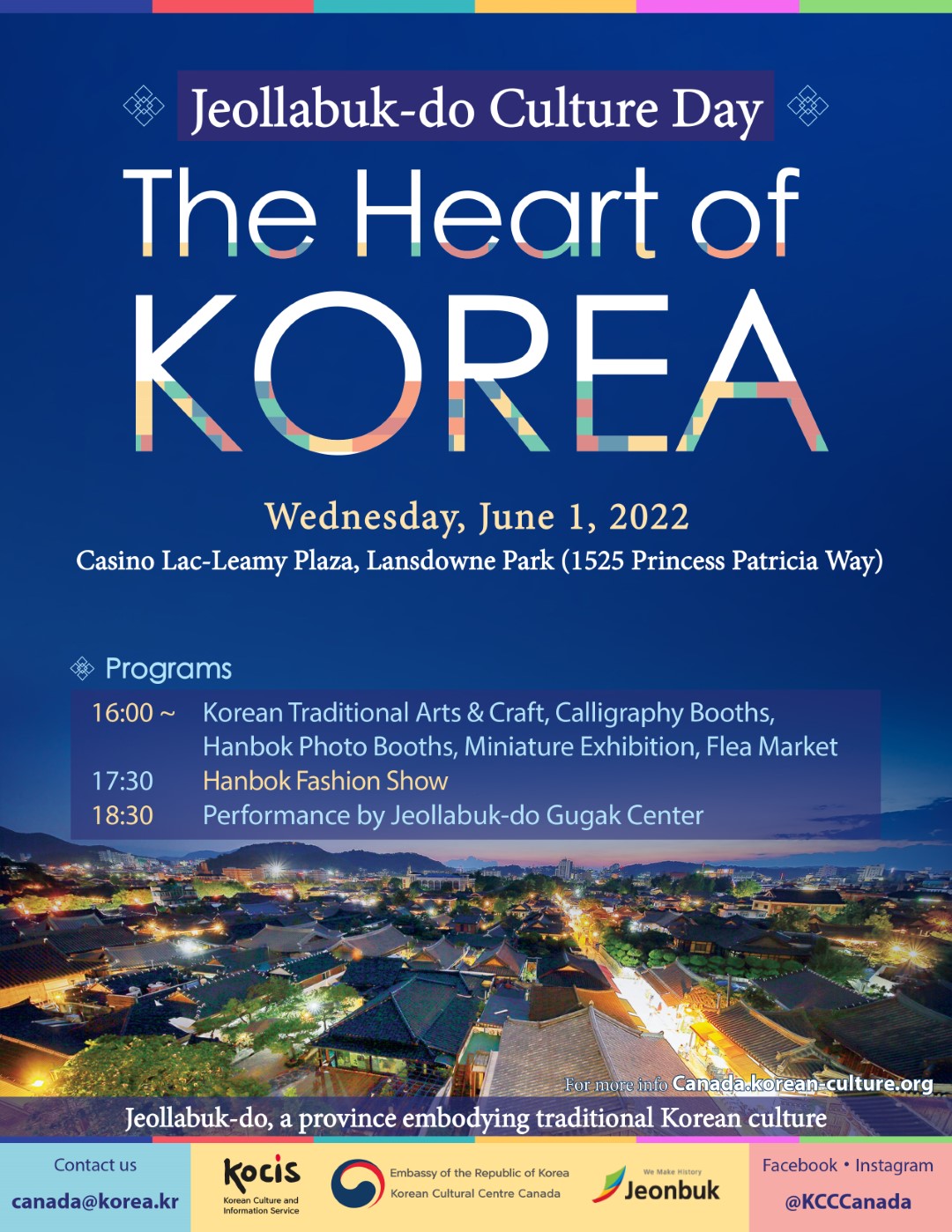 해외문화홍보원 (원장 박명순)과 주캐나다대사관 (대사 장경룡), 주캐나다 한국문화원 (원장 이성은)은 코로나 사태로 인한 규제가 완화되는 가운데 5월 캐나다 연방정부가 지정한 아시아 문화유산의 달을 맞이하여 캐나다인들이 한국의 문화를 직접 보고, 듣고, 체험할 수 있는 종합 문화 축제 '2022 Korea Week'를 진행 할 예정이다. 2022년 한국주간은 5월 21일부터 6월 2일까지 총 13일간 진행되며 이번 한국주간은 특별히 전라북도와 함께 친행하여 더욱 다양하고 풍성한 한국의 문화를 즐길 수 있도록 구성하였다.